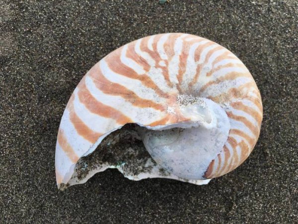 台南社大海廢社召集人晁瑞光說,這已是他這10多年來第3次拾獲鸚鵡螺。約10年前,他曾在台南四鯤鯓海岸淨灘時,撿到一個十分完整的鸚鵡螺,直徑約15至20公分大,而昨天撿到的這個鸚鵡螺的最外層已破裂不見,但仍可看出其原貌。